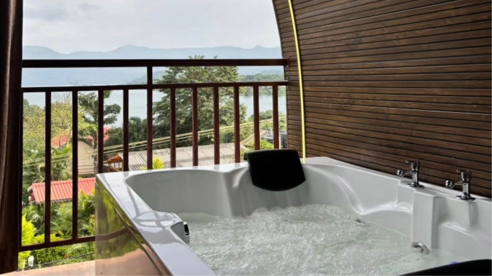 Relax in a private jacuzzi with lake-facing views.